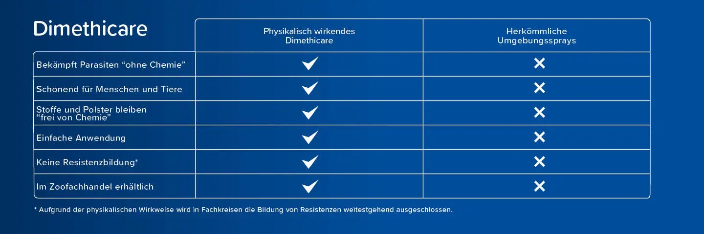 Das Silikonöl in Dimethicare verklebt die Gelenke und Atemöffnungen der Parasiten. So werden sie bewegungsunfähig und sterben ab. Auch Larven, Eier und Puppen werden so unschädlich gemacht.